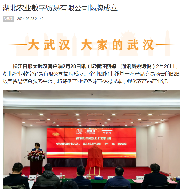 長江日?qǐng)?bào):湖北農(nóng)業(yè)數(shù)字貿(mào)易有限公司揭牌成立