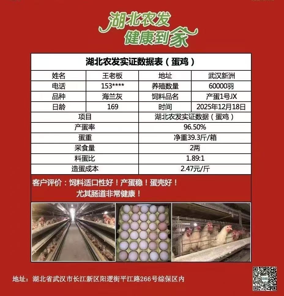 湖北農(nóng)發(fā)集團旗下省糧油進出口集團湖北農(nóng)發(fā)生物科技有限公司(以下簡稱:農(nóng)發(fā)生物科技)坐落于長江新區(qū)武漢新港陽邏綜合保稅區(qū),依托陽邏港區(qū)位優(yōu)勢打造優(yōu)質(zhì)飼料供給體系,農(nóng)嘉豐?系列“產(chǎn)蛋1號”飼料,在武漢新洲蛋雞養(yǎng)殖現(xiàn)場交出亮眼答卷:其6萬羽169日齡海蘭灰蛋雞,產(chǎn)蛋率達 96.50%,每箱蛋凈重 39.3 斤,料蛋比 1.89:1,造蛋成本僅 2.47 元 / 斤,實效獲養(yǎng)殖戶認可。